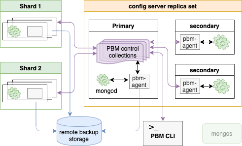 • PBM Control collections are special collections in MongoDB that store the configuration data and backup states. Both pbm CLI and pbm-agent use PBM Control collections to check backup status in MongoDB and communicate with each other.